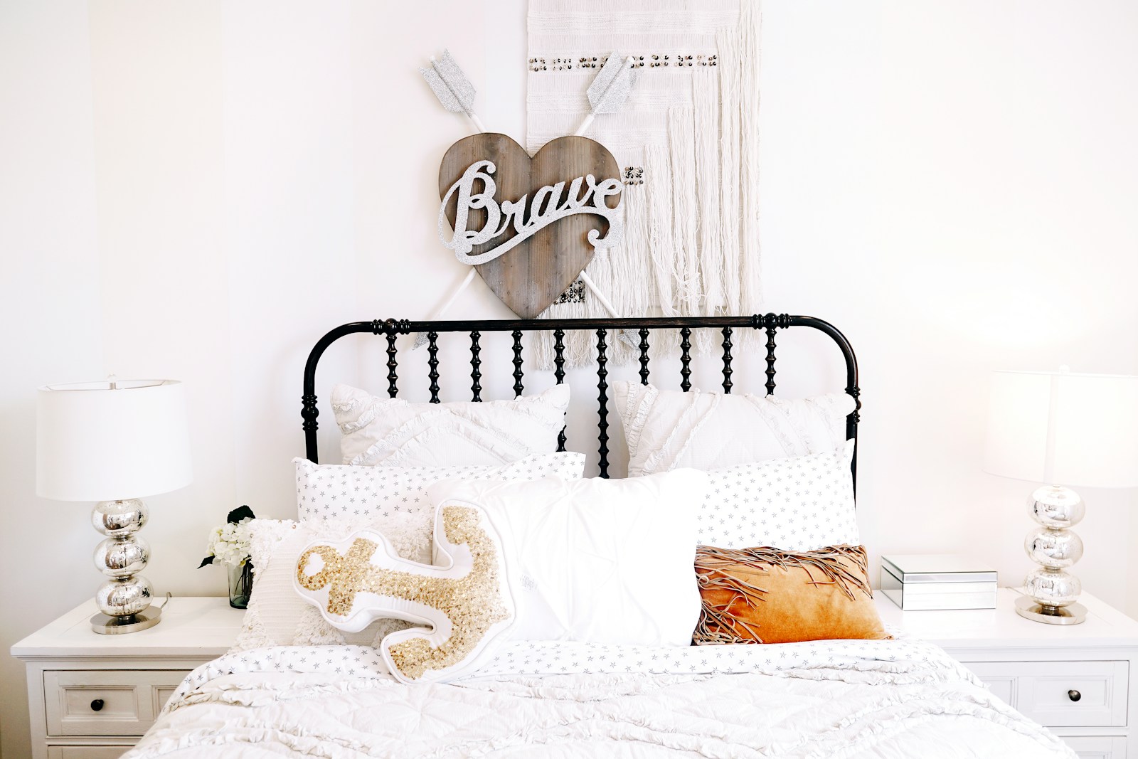 white table lamp on gray end tablegray bedspreablack table lamp on nightstand